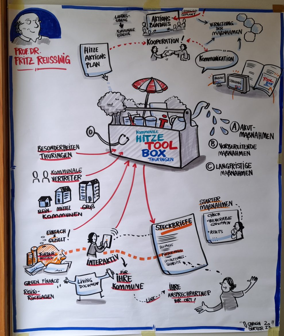 Maximilian Hollburg (TMUEN) und Katrin Müller-Zahm (TMASGFF) zeichneten den Weg von der kommunalen Hitze-Toolbox zum Thüringer Hitzeaktionsplan. Die Hitze-Toolbox ist eine Planungshilfe für den Hitzeschutz vor Ort in zwei Schritten: Betroffenheit identifizieren und Maßnahmen auswählen. Außerdem enthält die Hitze-Toolbox Hinweise auf Hilfen zur Umsetzung. Auf dieser Basis wird gemeinsam von Umwelt- und Gesundheitsministerium und unter Einbeziehung der Kommunen sowie relevanter Organisationen ein Hitzeaktionsplan für Thüringen erarbeitet. Damit sollen die Thüringer:innen für das Thema sensibilisiert und informiert werden. Außerdem werden die Kommunen beim Schutz der Bevölkerung vor Hitze unterstützt.