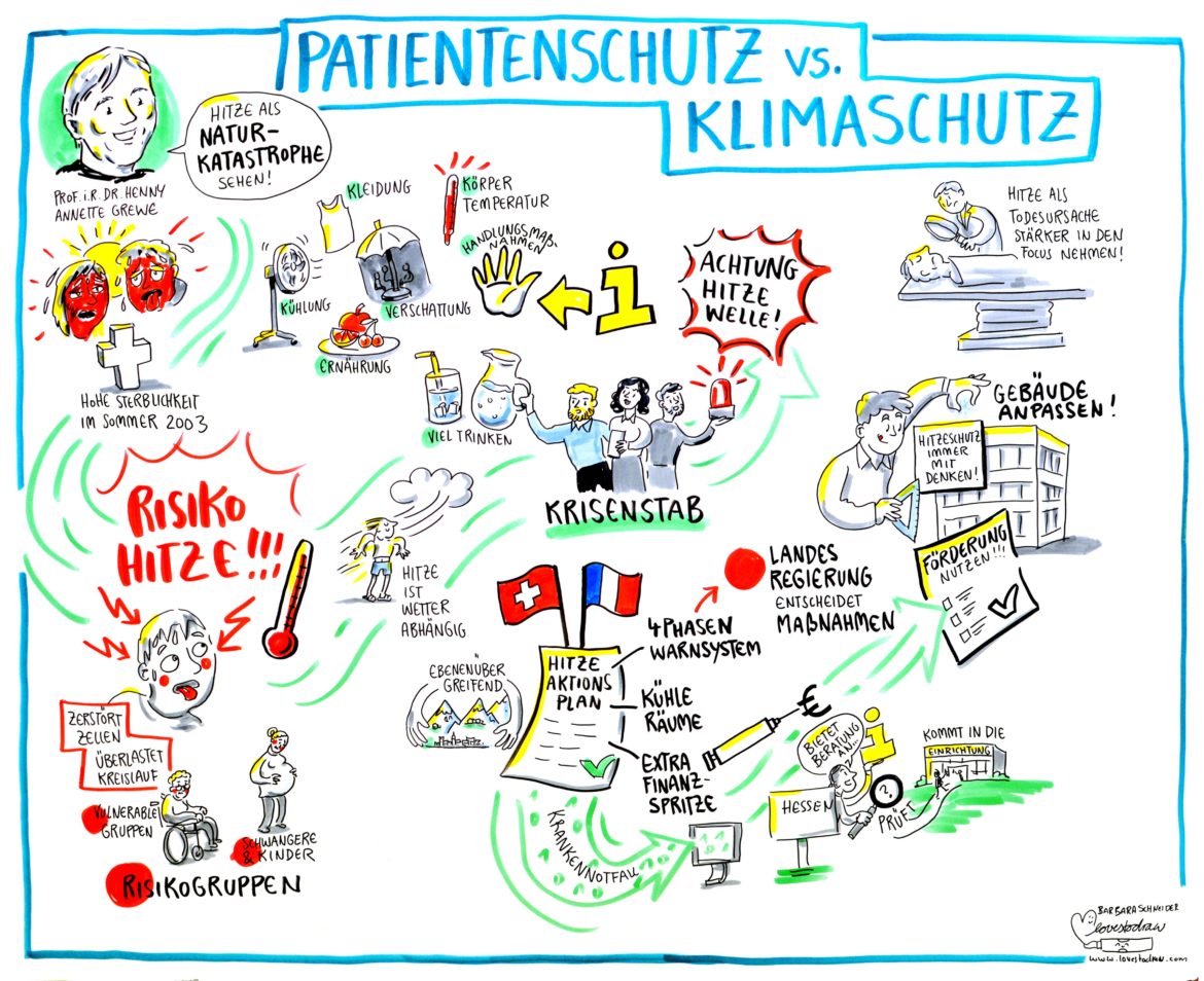 Der Tag startete mit einem spannenden Vortrag von Prof. Dr. Henny Annette Grewe. Als Professorin für medizinische Grundlagen der Pflege an der Hochschule Fulda hat sie u. a. zu Gesundheitsschutz sowie zu Klimawandel und Gesundheit geforscht. In ihrem Vortrag ging sie insbesondere auf das Thema Hitze ein. Sie stellte heraus, dass Hitzeschutz eine komplexe Herausforderung auf vielen Ebenen ist. Ihr Plädoyer: Patientenschutz und Klimaanpassungen dürfen sich nicht gegenseitg ausschließen, auch wenn das manchmal schwierig sein mag – „das eine tun, ohne das andere zu lassen“!